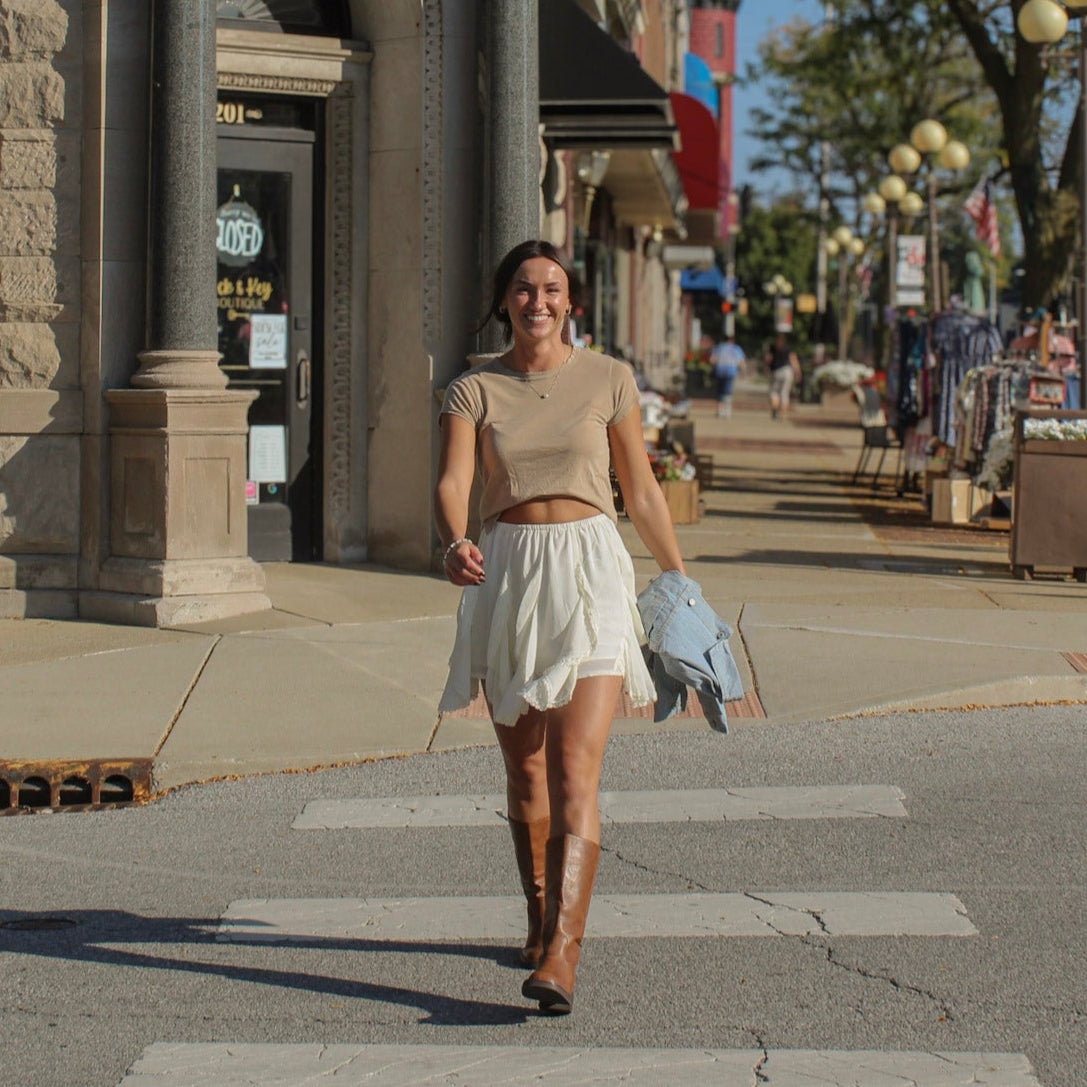 Featuring tiered layers of soft white lace, this mini skirt brings a romantic flair to any outfit. The flattering high-waisted fit hugs just right, while the flowy silhouette adds playful movement with every step. Fully lined for comfort and coverage, it’s perfect for brunch dates, beach strolls, or dressing up with heels for a night out.