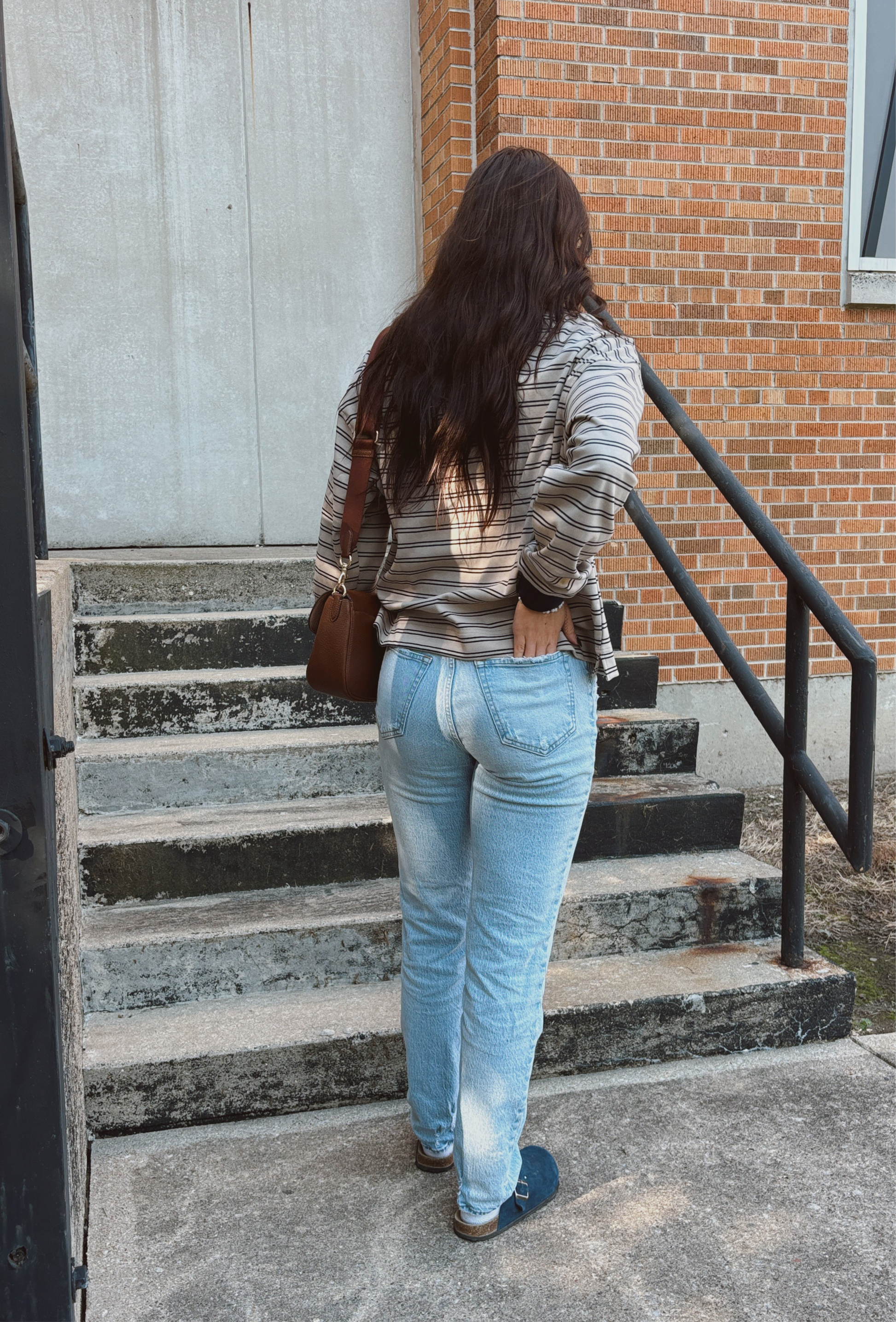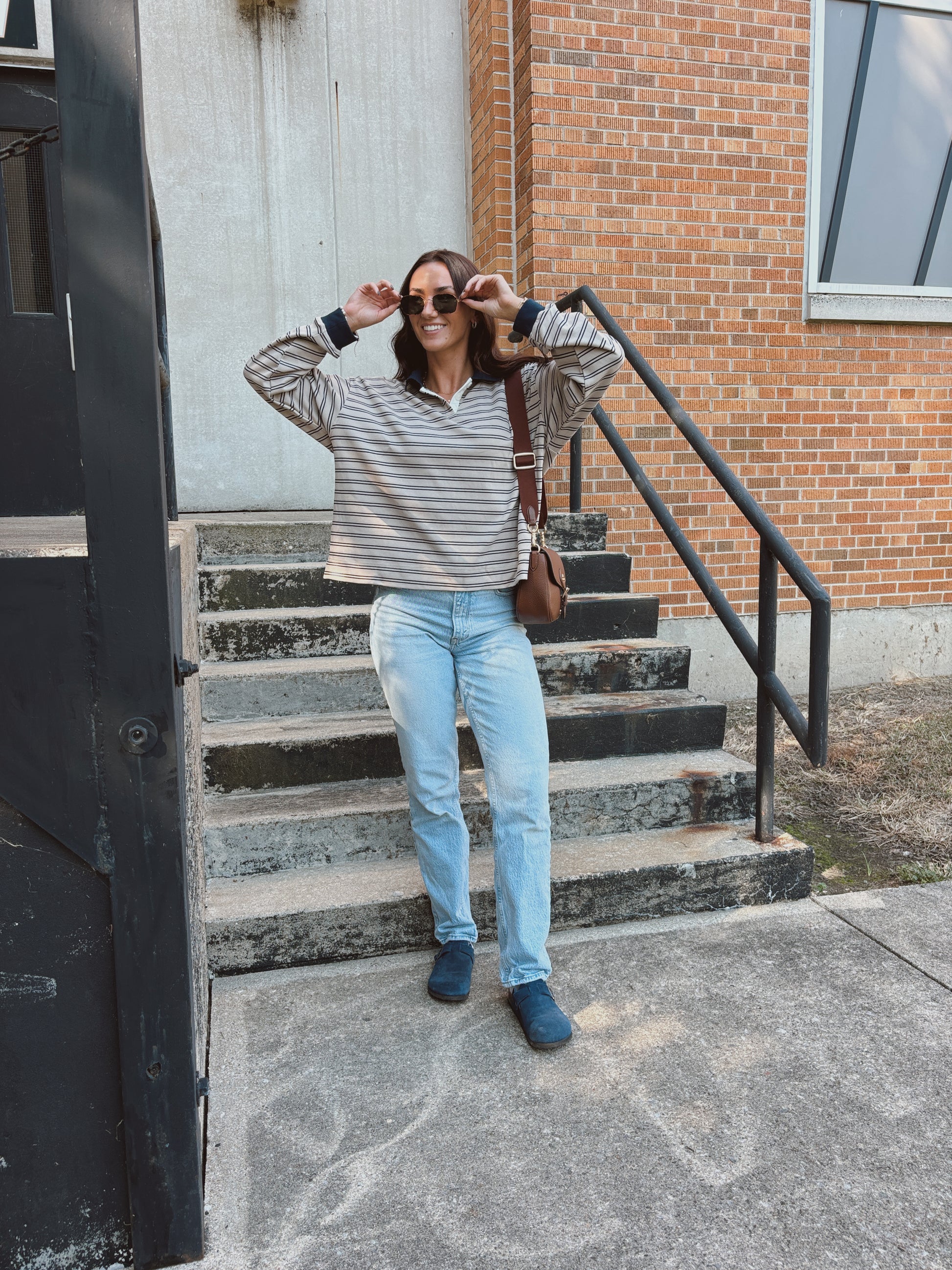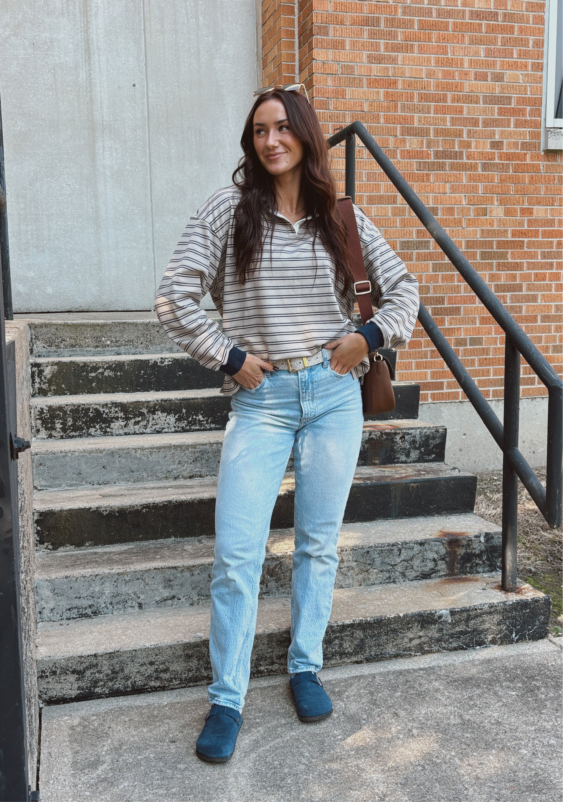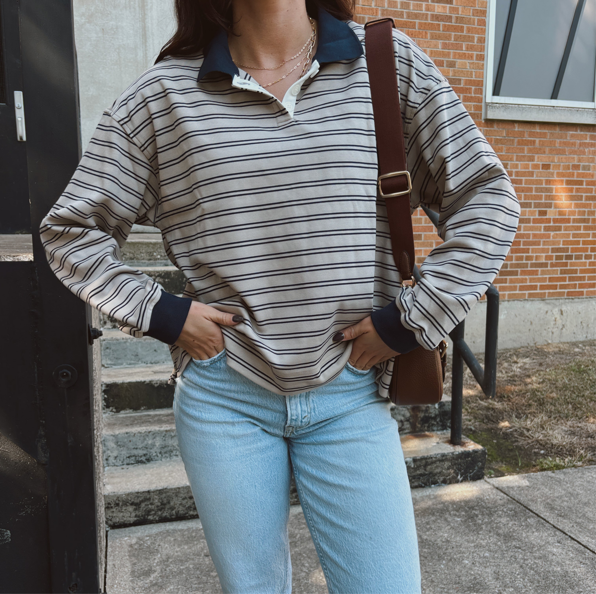 Classic and comfortable, this quarter-button striped collared long sleeve top brings timeless style to your everyday wardrobe. Featuring a smart collar, partial button-front detail, and a relaxed striped pattern, it's perfect for casual days or laid-back outings. Pair it with jeans or trousers for an effortlessly polished look.